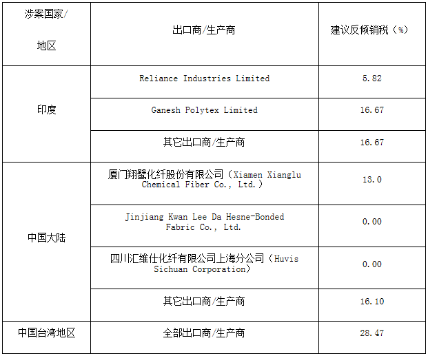 On April 20, 2009, Indonesia launched an anti-dumping investigation into polyester staple fiber imported from China, India, and Taiwan. On November 23, 2010, Indonesia officially levied anti-dumping duties on the products involved in the above-mentioned countries and regions. The tax rate on the products involved in China was 0-11.94%. On August 19, 2019, Indonesia extended the validity period of anti-dumping duties on products involved in China, India, and Taiwan China for the second time. The tax rate on products involved in China is 0-16.10% and will be valid until August 18, 2022. On August 6, 2021, Indonesia launched the third anti-dumping sunset review investigation on polyester staple fiber from China, India, and Taiwan. The Indonesian tariff number of the product involved is 5503.20.00.